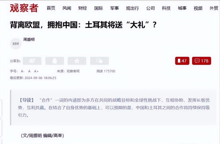 2016政变后好意思国制裁,2022俄乌战又得赈济乌克兰,债务堆山,外汇储备见底。土耳其得找新伙伴救场,纪念就找上中国。2024年3月,他们大使在论坛上夸中国经济孝顺,魄力一百八十度转弯。