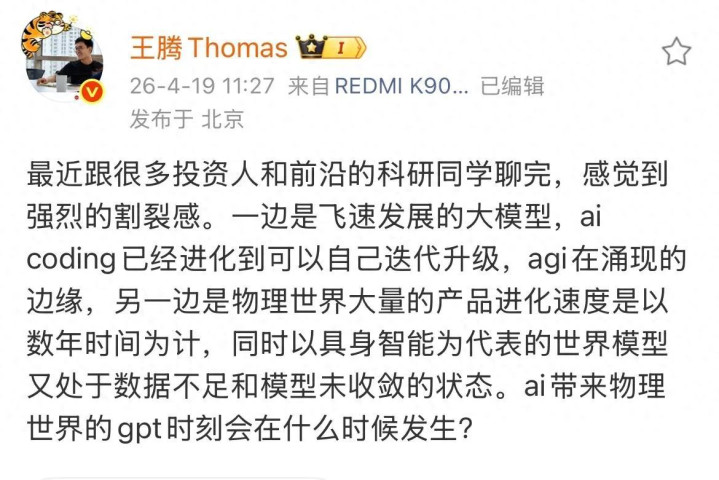 王腾临了问了一个全球都轻柔的问题:AI带来物理寰宇的“GPT时刻”,到底什么时候会发生?