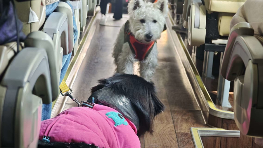 刚上大巴,几只小狗便因生疏环境起了争执,犬吠声绵绵连续。思要让一只小狗幽闲下来,难度并不亚于安抚哭闹的婴儿。但随行的家长们彰着训导都备:缓解焦虑的零食、漏食球、神志平稳喷剂、宠物背包等一应俱全。