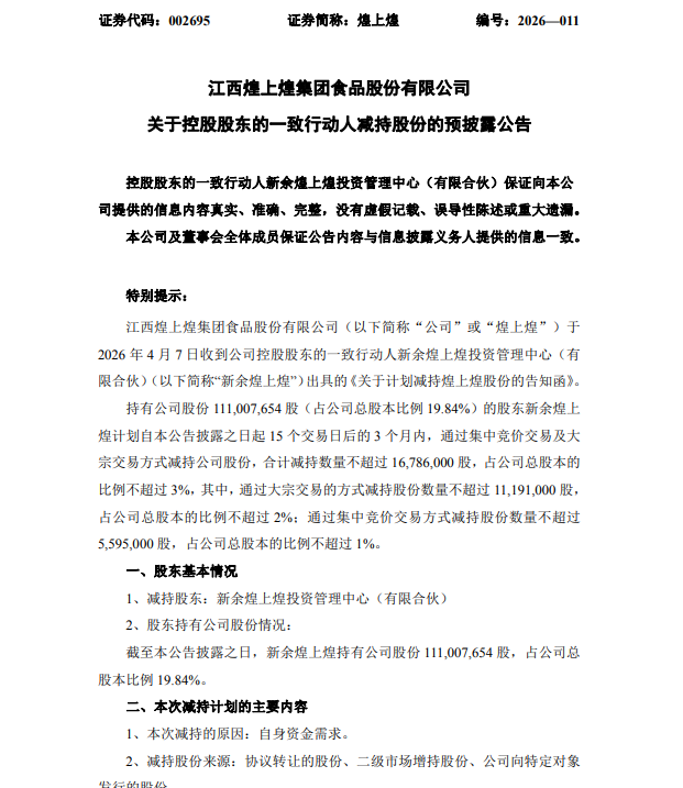 4月7日晚间,煌上煌(002695.SZ)发布公告称,公司鼓吹新余煌上煌筹算自本公告暴露之日起15个交昔日后的3个月内,通过结合竞价交往及大批交往样子共计减握不跳动1678.60万股,占公司总股本的比例不跳动3%。