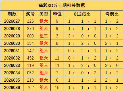 开奖总结:福彩3D上期奖号为762,和值为15,其中奖号012路比为1:1:1,奇偶比为1:2。