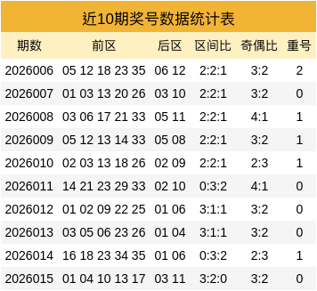 近10期前区的三区比为19:20:11,其中前2区出号数较多,3区前区出号数较少。上期前区三区比为3:2:0,1区前区发达较强。本期存眷三区比2:1:2。