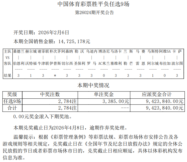 北京本事2月6日,输赢彩第26024期任九开奖后果揭晓。本期任九开出2784注,单注奖金3385元。本期任九投注总和为14,725,178元。