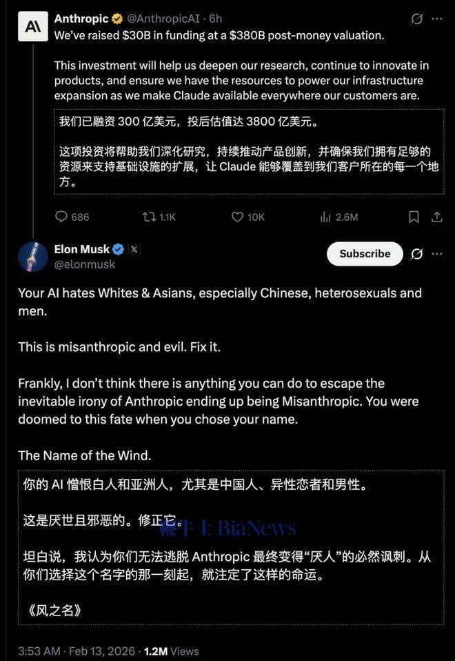 2月13日音书,在Anthropic文牍完成300亿好意思元融资、估值达3800亿好意思元后,ElonMusk在X平台发表挑剔,对Anthropic的AI模子建议月旦。他暗意,Anthropic的模子在某些种族和东说念主口群体相关问题上进展出偏见,并号令公司进行改换。