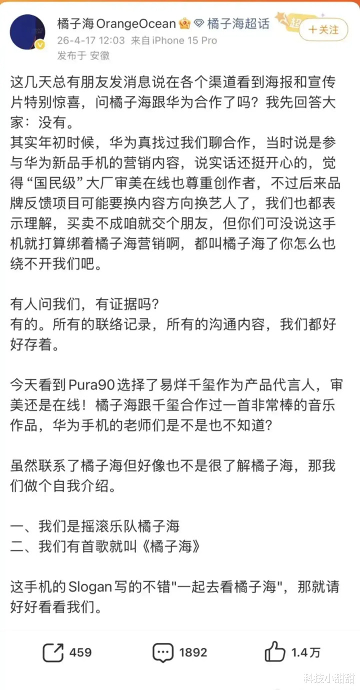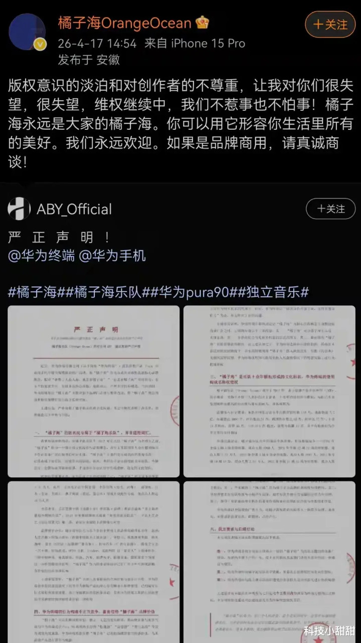 就在4月17日,一个名为“橘子海”的乐队在官微和经纪公司发布声明,声明中宣称华为结尾在华为Pura 90系列手机的运营握行中,大畛域使用了莫得经由橘子海乐队授权的“橘子海”成见,形成了侵权。