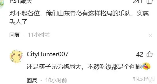 “抱歉诸君,俺们山东青岛有这样步地的乐队,实属丢东说念主了”;“还是筷子昆季步地大,否则吃饭都是个问题。”