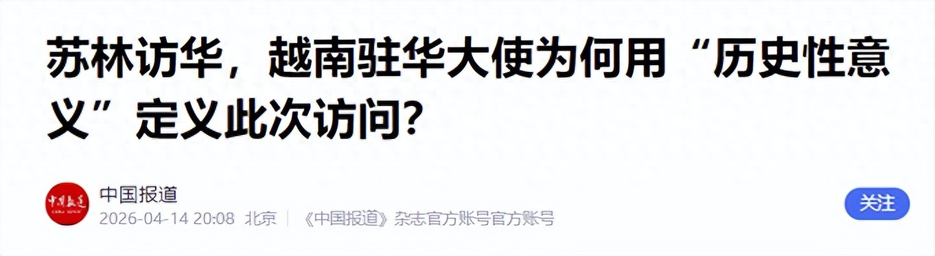 2026年4月14日到17日,越共中央总通知、越南国度主席苏林对中国进行了为期四天的国是访谒。